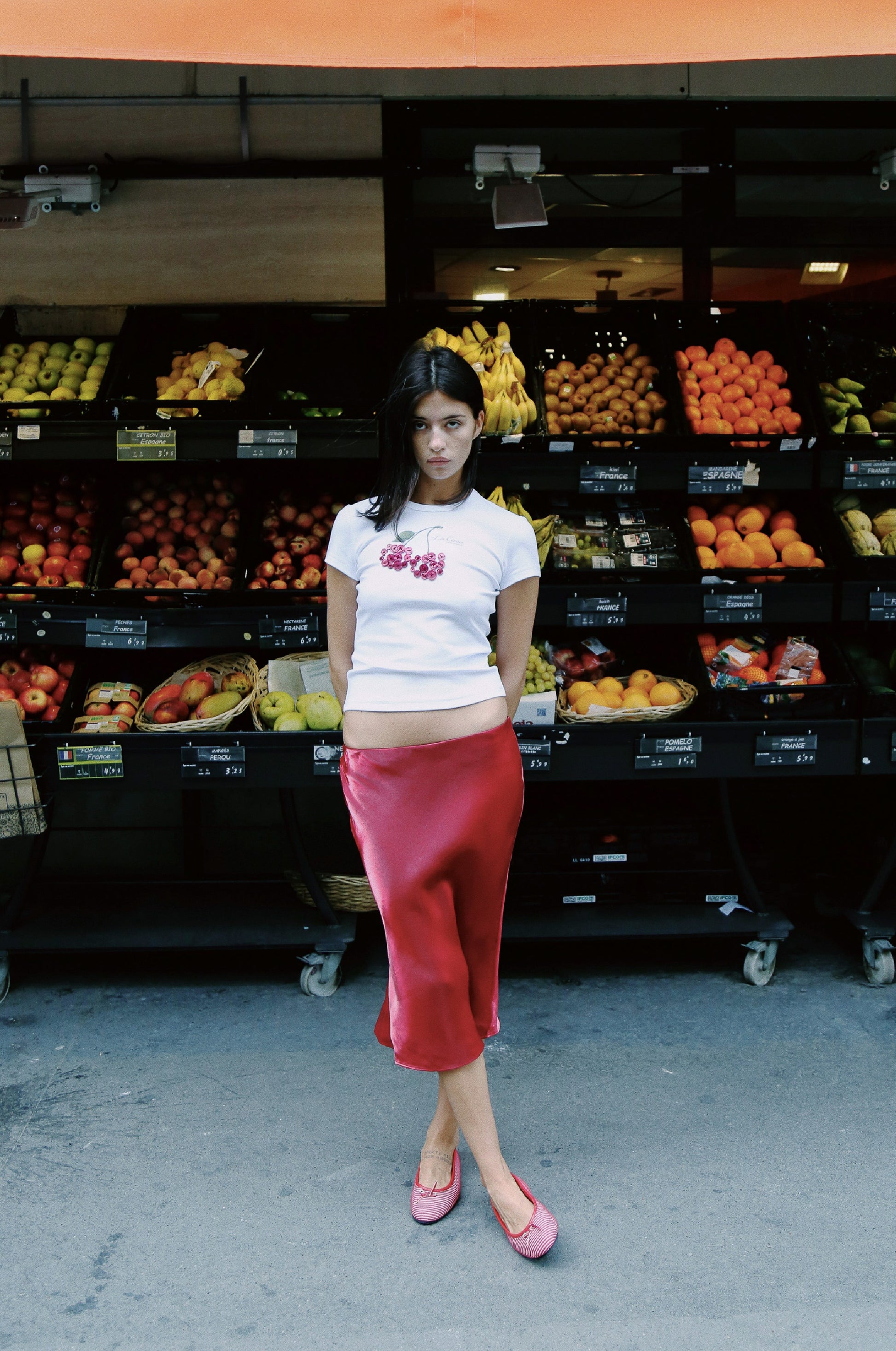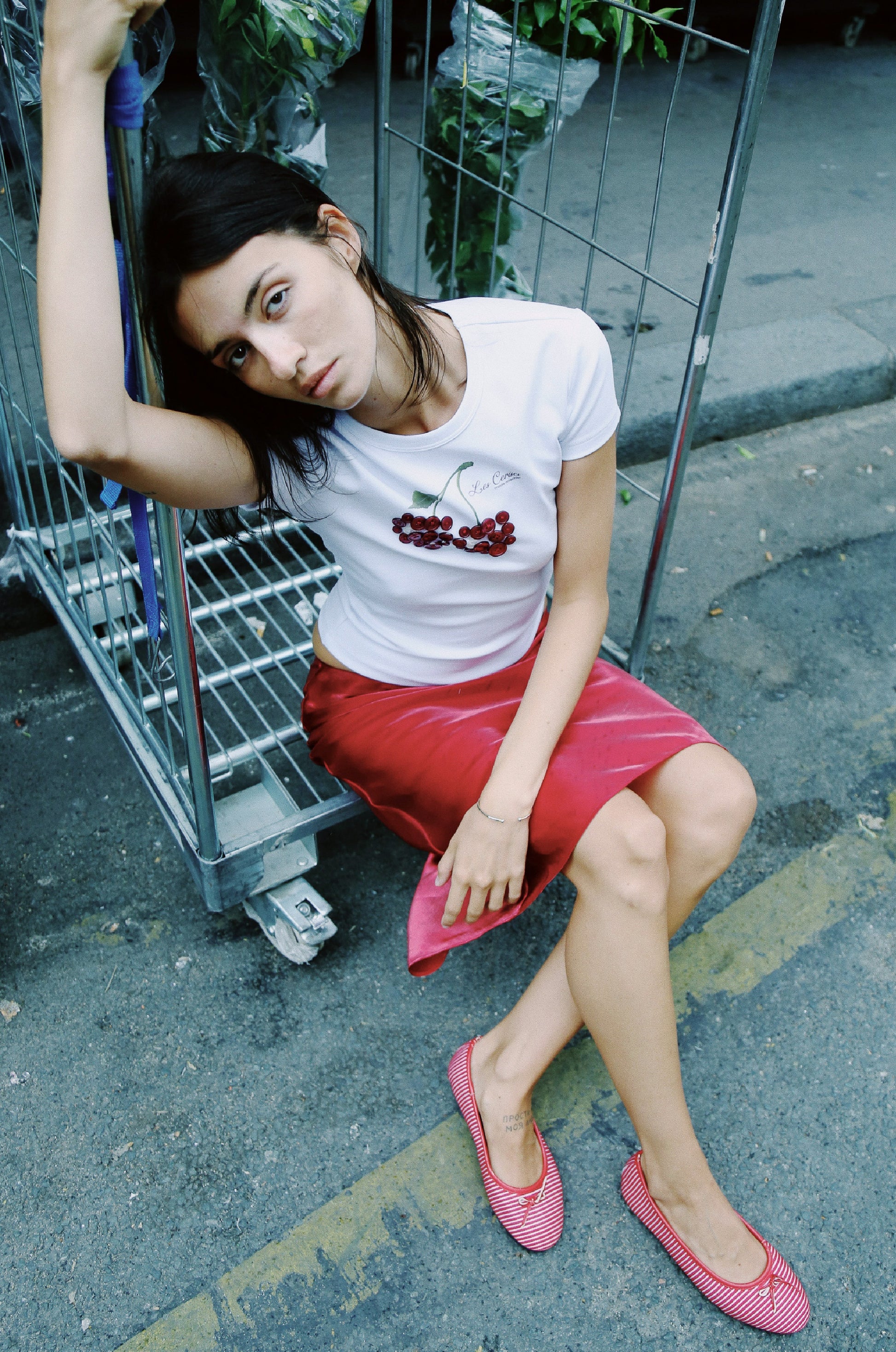 Carefully embellished with individually sized and red-coloured buttons arranged to form a cherry motif. Each tee is unique, showcasing unexpected beauty.