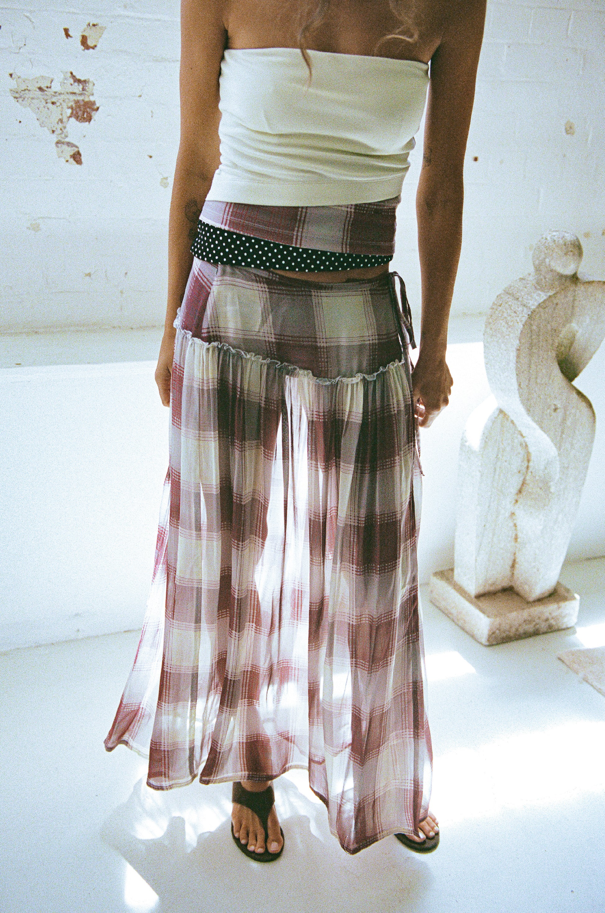 Fig Tart is our custom tartan print, designed for a transparent fabric that beautifully drapes and subtly exposes through sunlight.