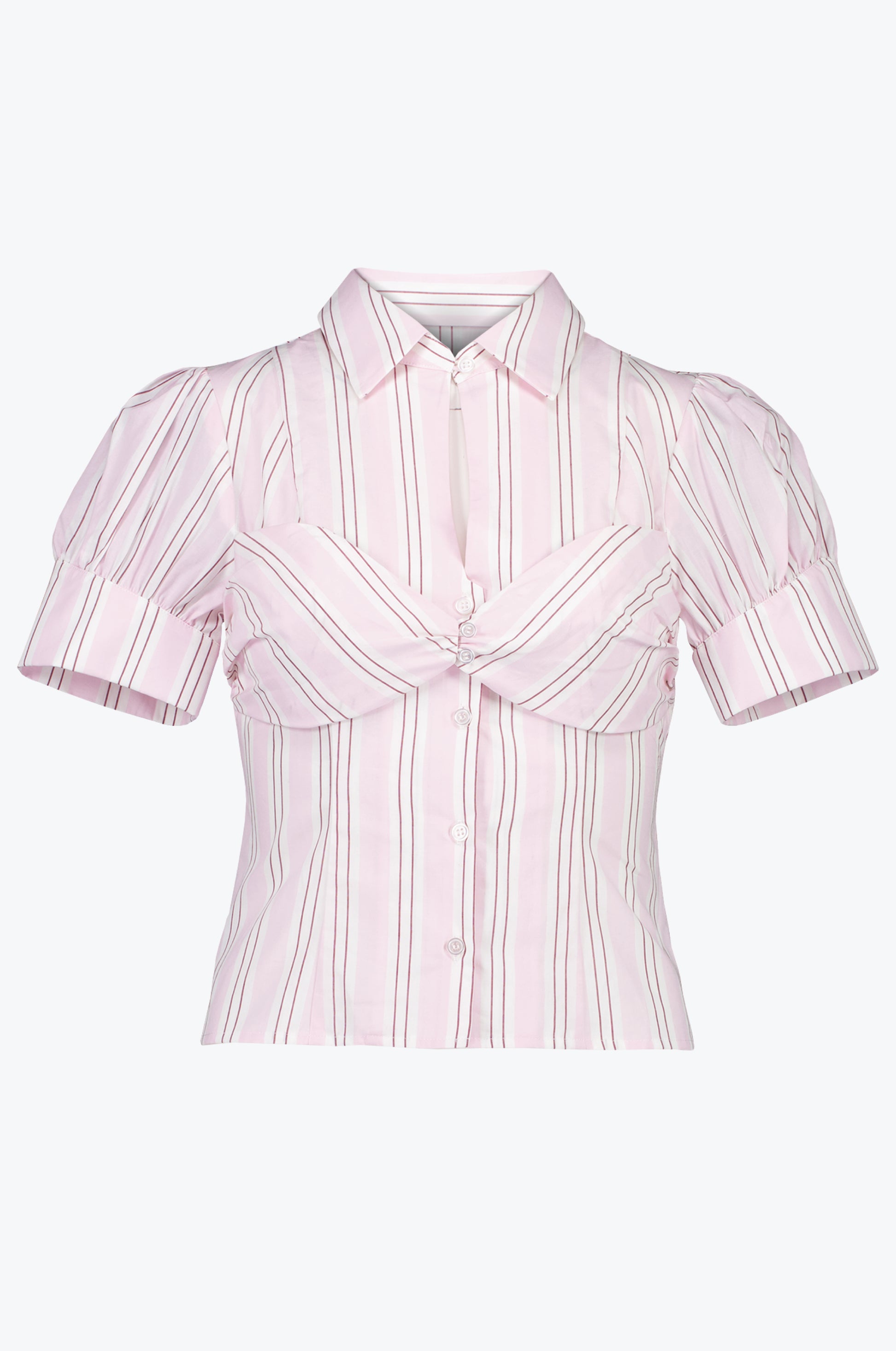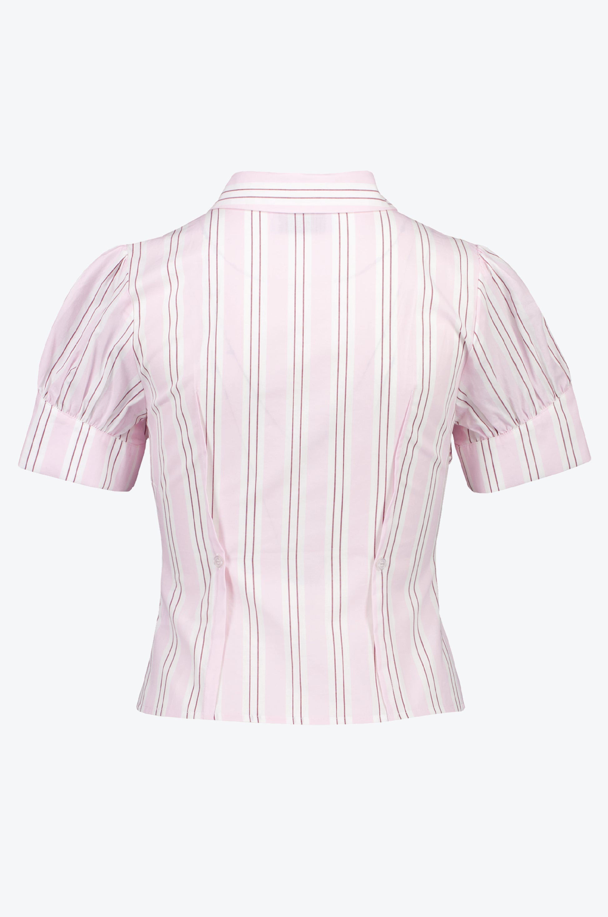 Featuring puff sleeves and tailored armbands, with a sharp collar that fastens neatly at the neckline, and a layered panel that drapes across the bust, secured by two small buttons for added dimension.