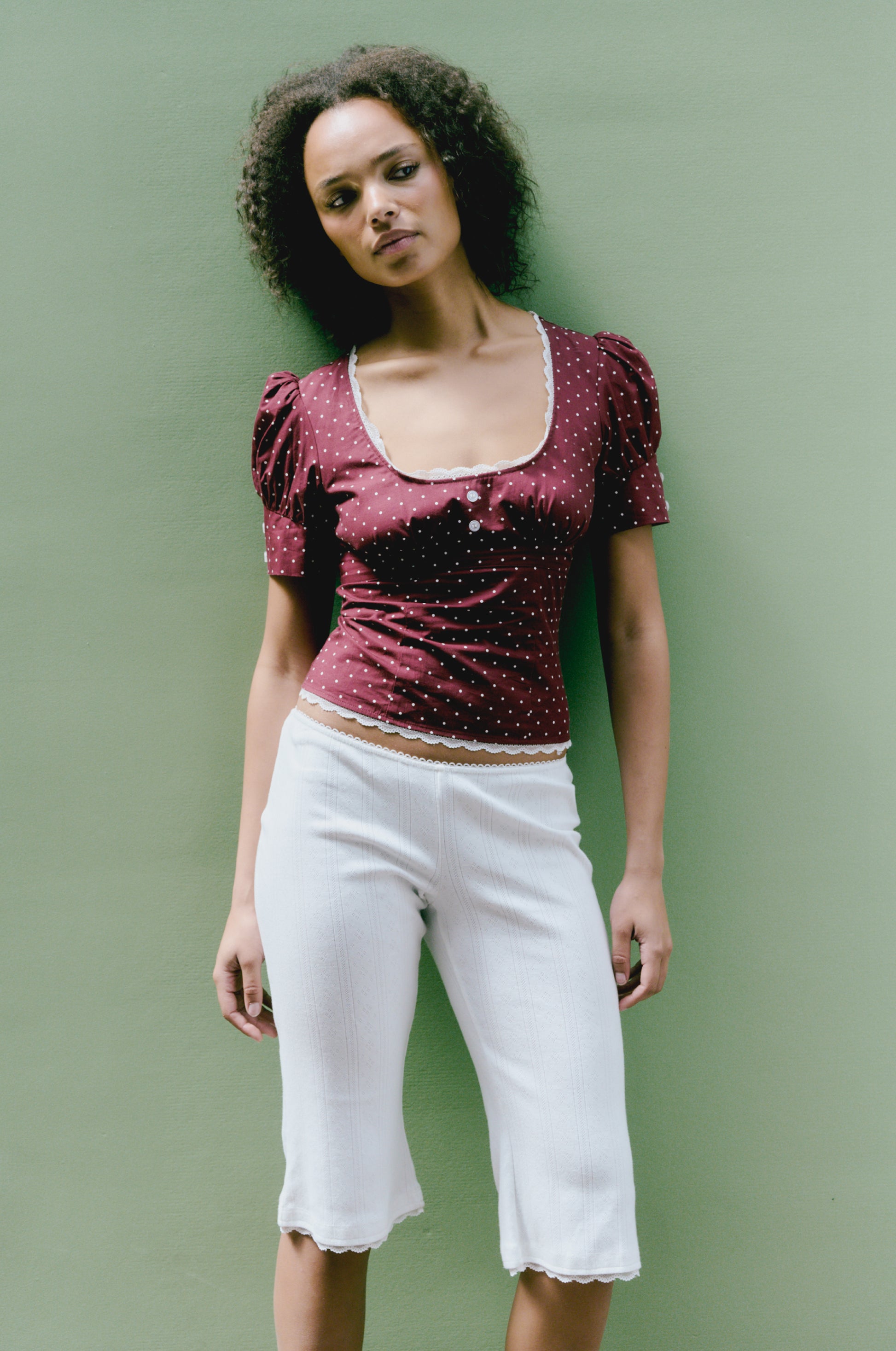 The Minette Scoop Blouse is a flattering wardrobe staple in a timeless white polka dot, designed with romantic puff sleeves and dainty details.