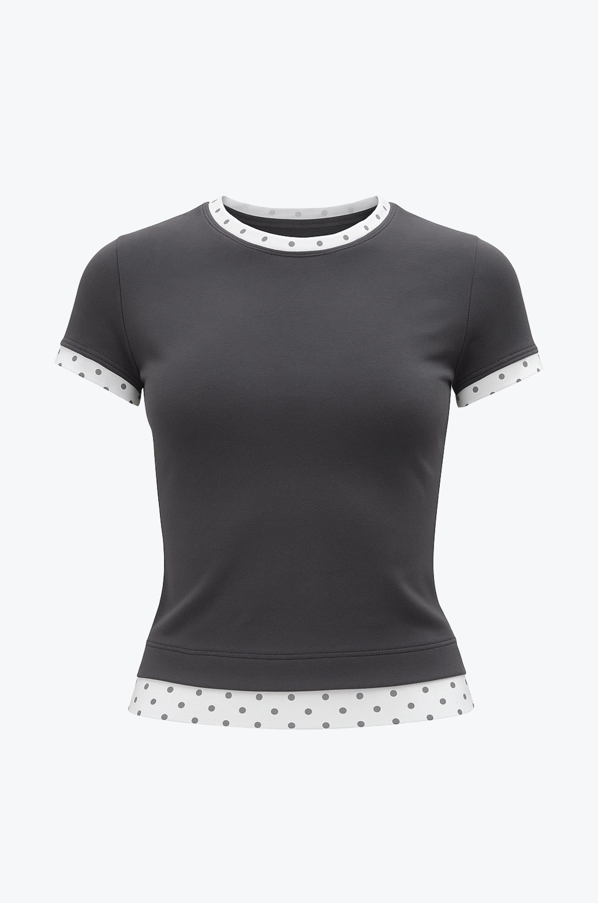 The base tee is crafted in a versatile Charcoal, with contrasting white and black polka dot trims. Crafted in a heavy, soft stretch cotton.