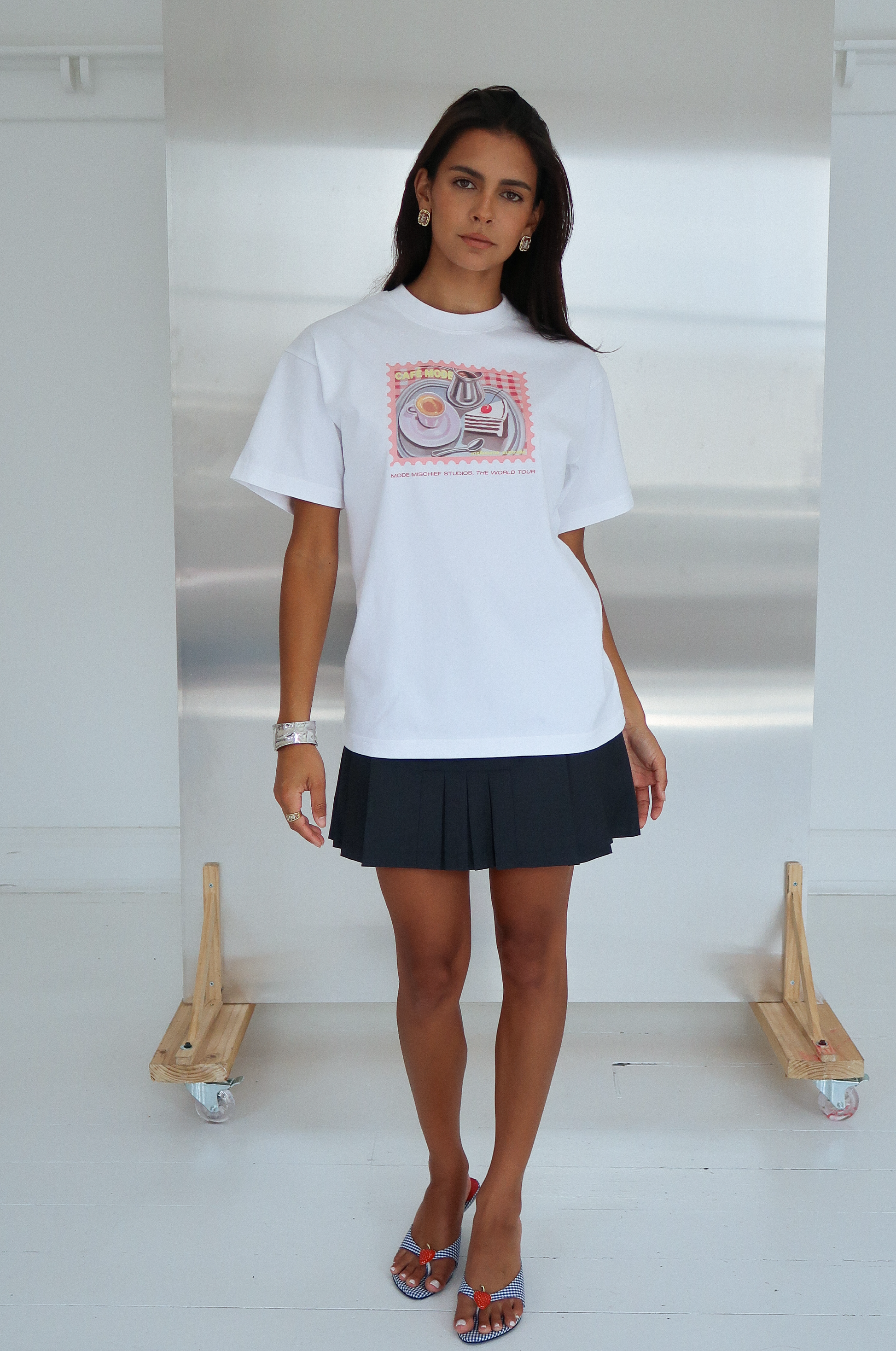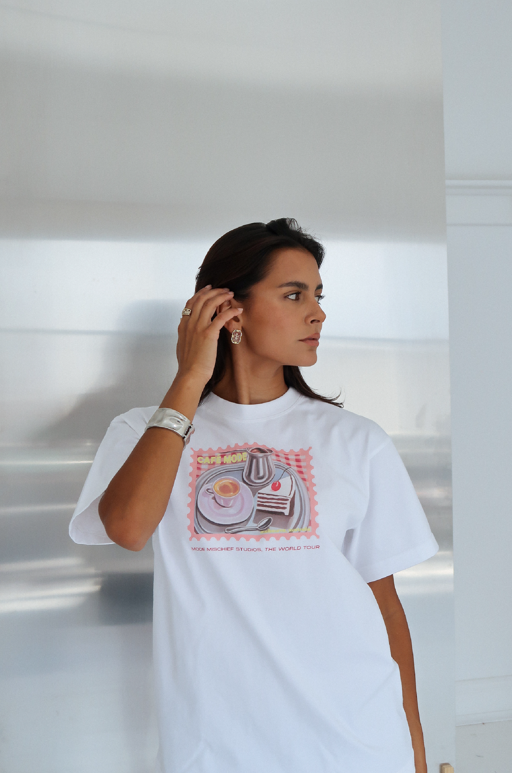 Our oversized graphic tee is the perfect addition to your capsule wardrobe and a way to make a statement, with our unique Café Mode graphic - a gingham, espresso & cake delight.