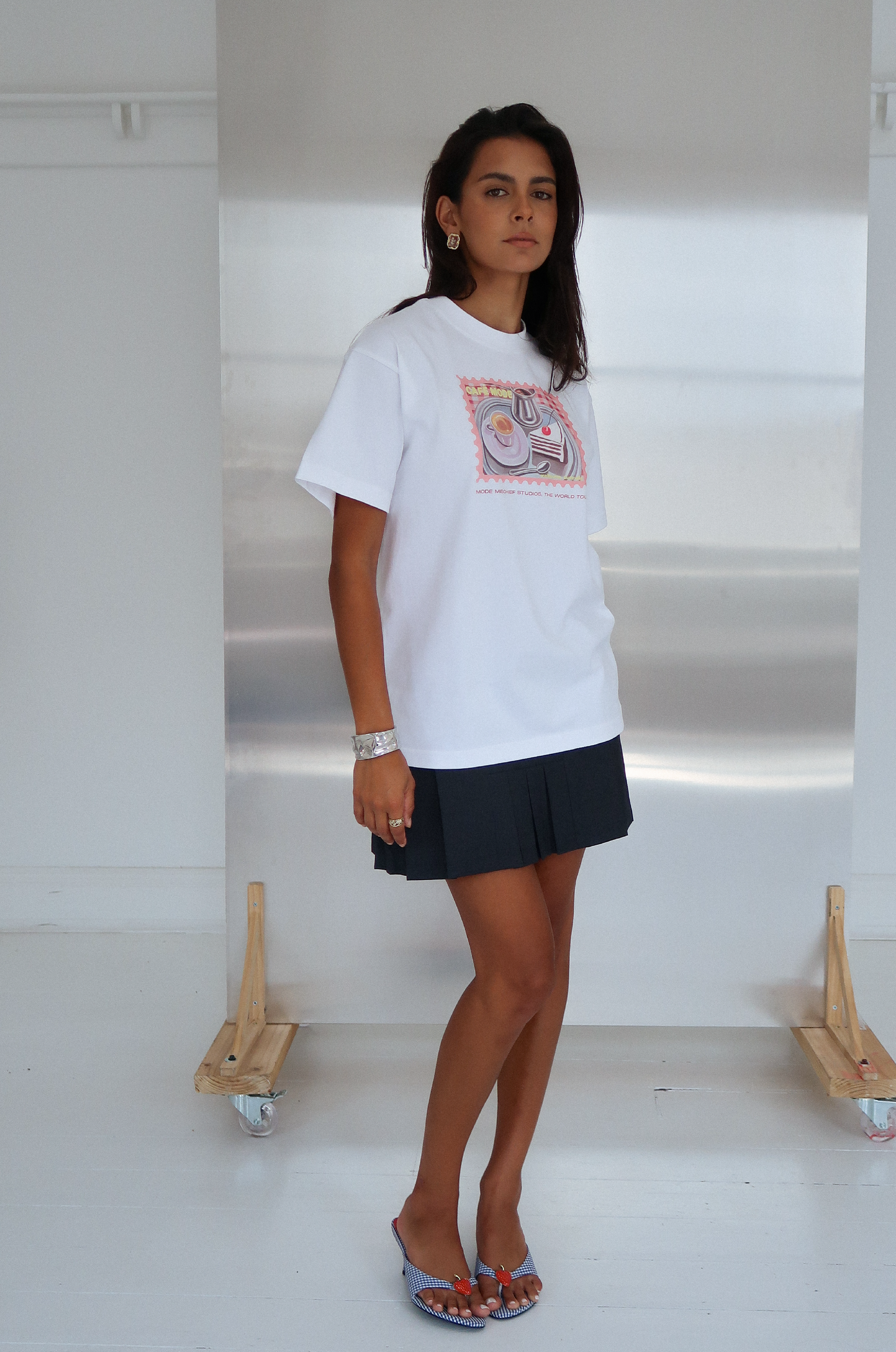 Crafted with a sturdy cotton that forms a boxy appearance. Each T-shirt is slightly oversized and cropped to bring a sophisticated approach to the traditional oversized tee.