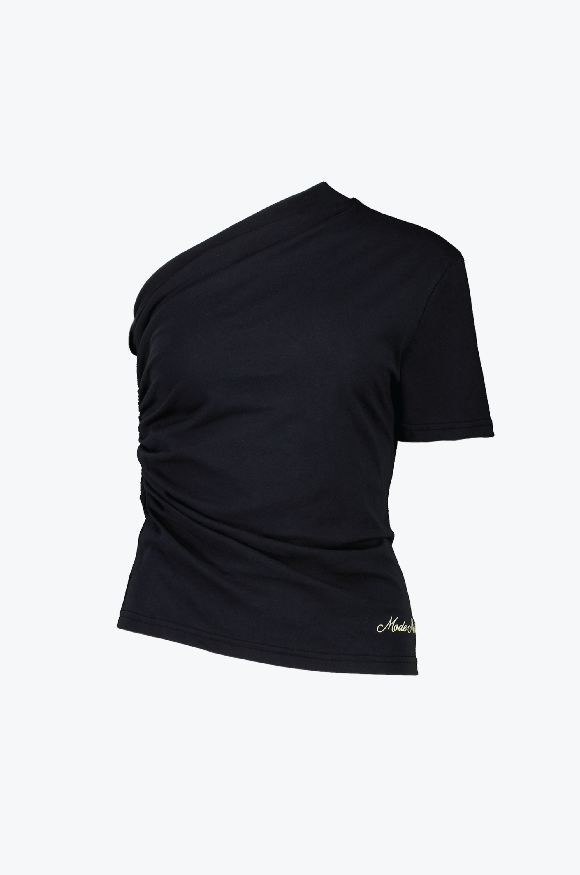 Featuring a one shoulder silhouette, with one left sleeve. The silhouette is elevated with draped neckline; a natural pull that allows the top to take form, creating a flattering ripple effect.