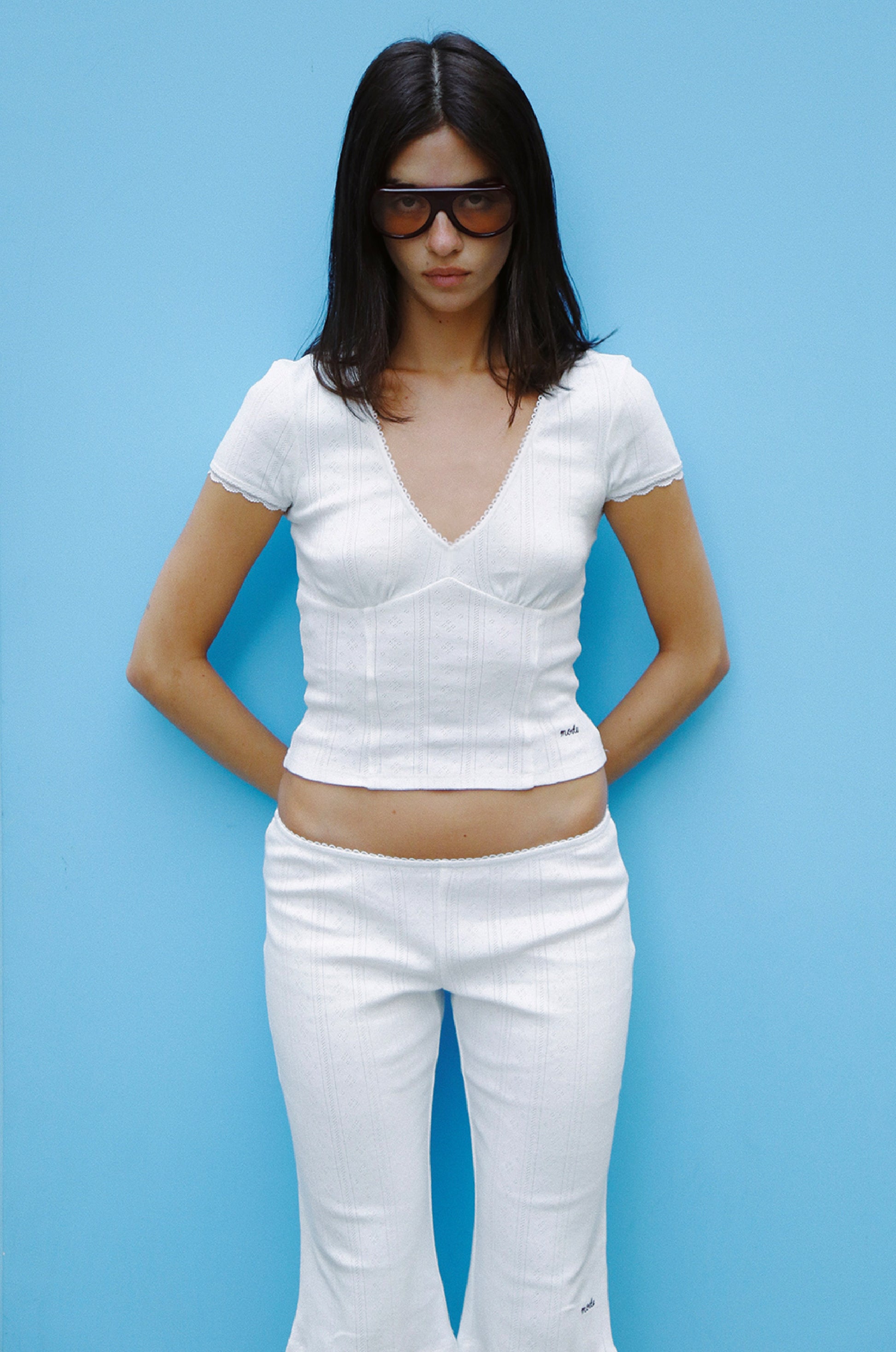 Crafted from dainty white 100% cotton pointelle and finished with a minimal elastic waist for a refined, effortless fit.
