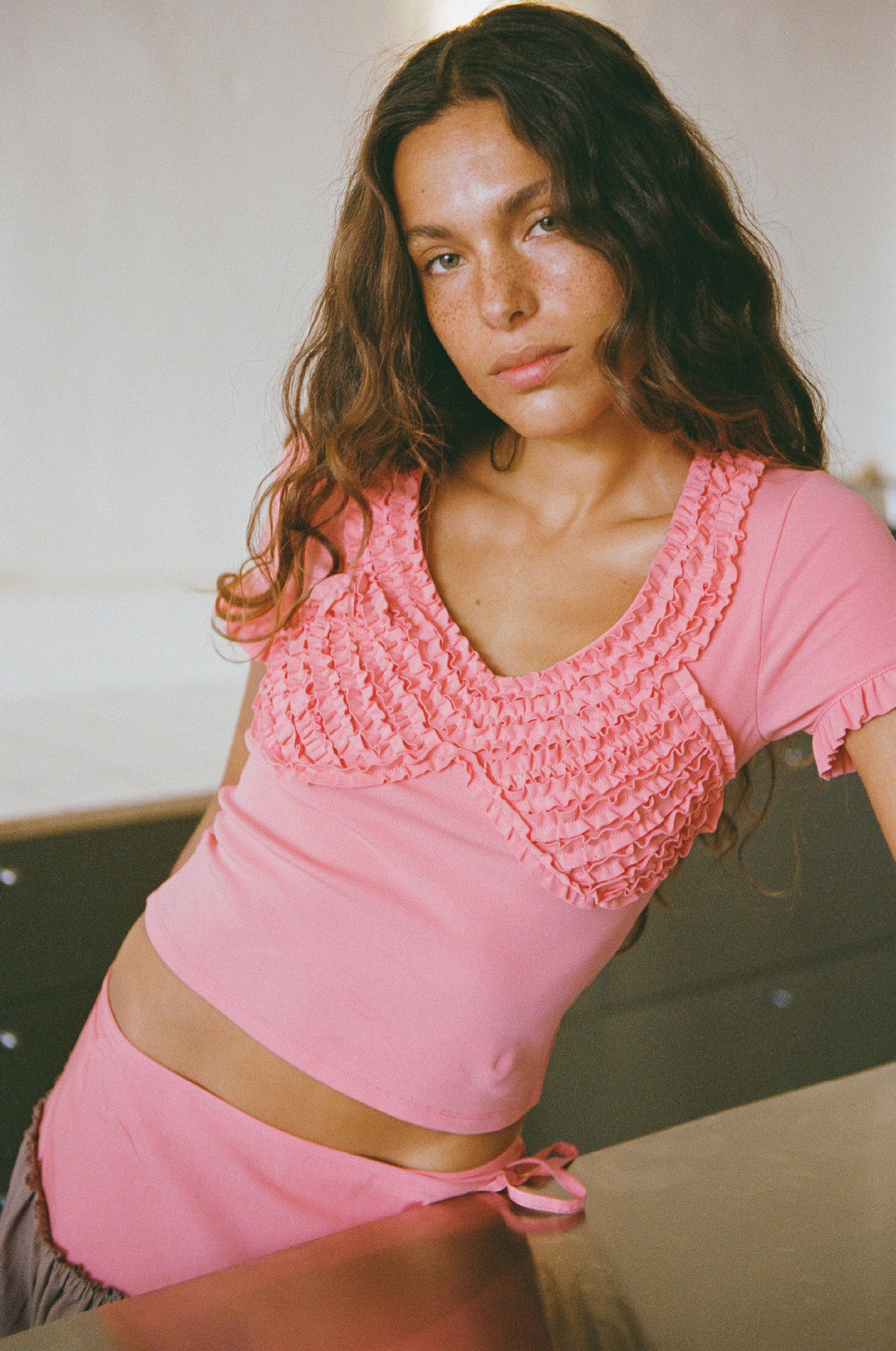 Featuring a low scoop neckline, detailed with unique, curated ruffles that form the shape of a bralette. Designed with short sleeves with ruffle details at the hem.