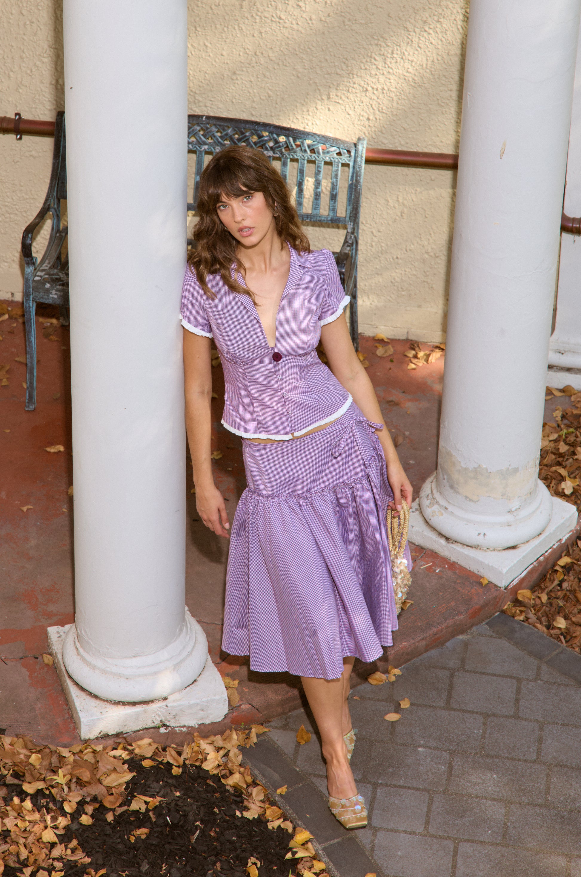 A nod to the 80s - The Vivienne blouse in our new Plum Gingham print is the chic embodiment of an iconic era.